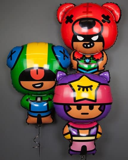 Фольгированные или латексные воздушные шары с изображением персонажей из Brawl Stars. В данном случае уместно подбирать шарики по характеру одаряемого. Харизматичным и сдержанным ребятам можно подарить шарик с Байроном, смелым и решительным девушкам – Амбер или Белль, активным и любознательным людям – воздушный шарик с изображением Беа или Биби. А для спортивных и сильных представителей мужского пола подойдет воздушный шарик с Булом.